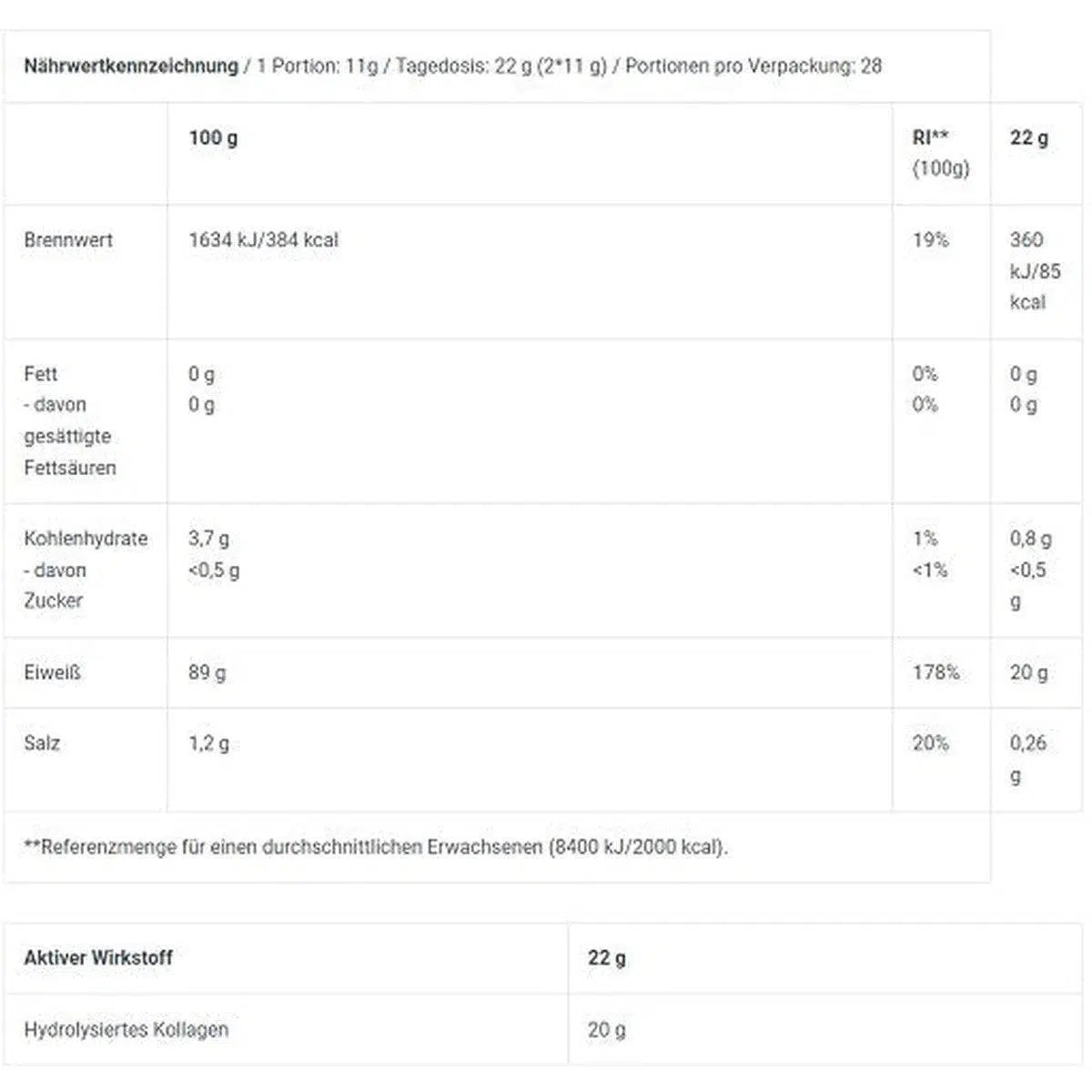 Hydrolysiertes Kollagen 91%, Säuerungsmittel (Citronensäure), Aromen, Maltodextrin, Rote Bete-Konzentrat-Pulver [Maltodextrin, Rote Bete-Konzentrat, Säuerungsmittel (Citronensäure)], Süßungsmittel (Sucralose), Speisesalz, Farbstoff (Echtes Karmin). Hergestellt in einem Betrieb, in dem MILCH, EIER, SOJA, ERDNÜSSE, SCHALENFRÜCHTE, SELLERIE, FISCH, KREBSTIERE, WEICHTIERE und Schwefeldioxid bearbeitet werden.