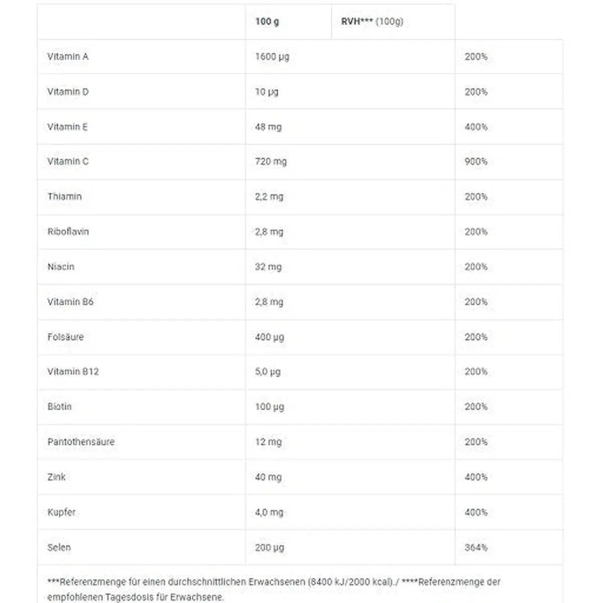 | Inhaltsstoff | pro 100 g | NRV*** (100 g) |