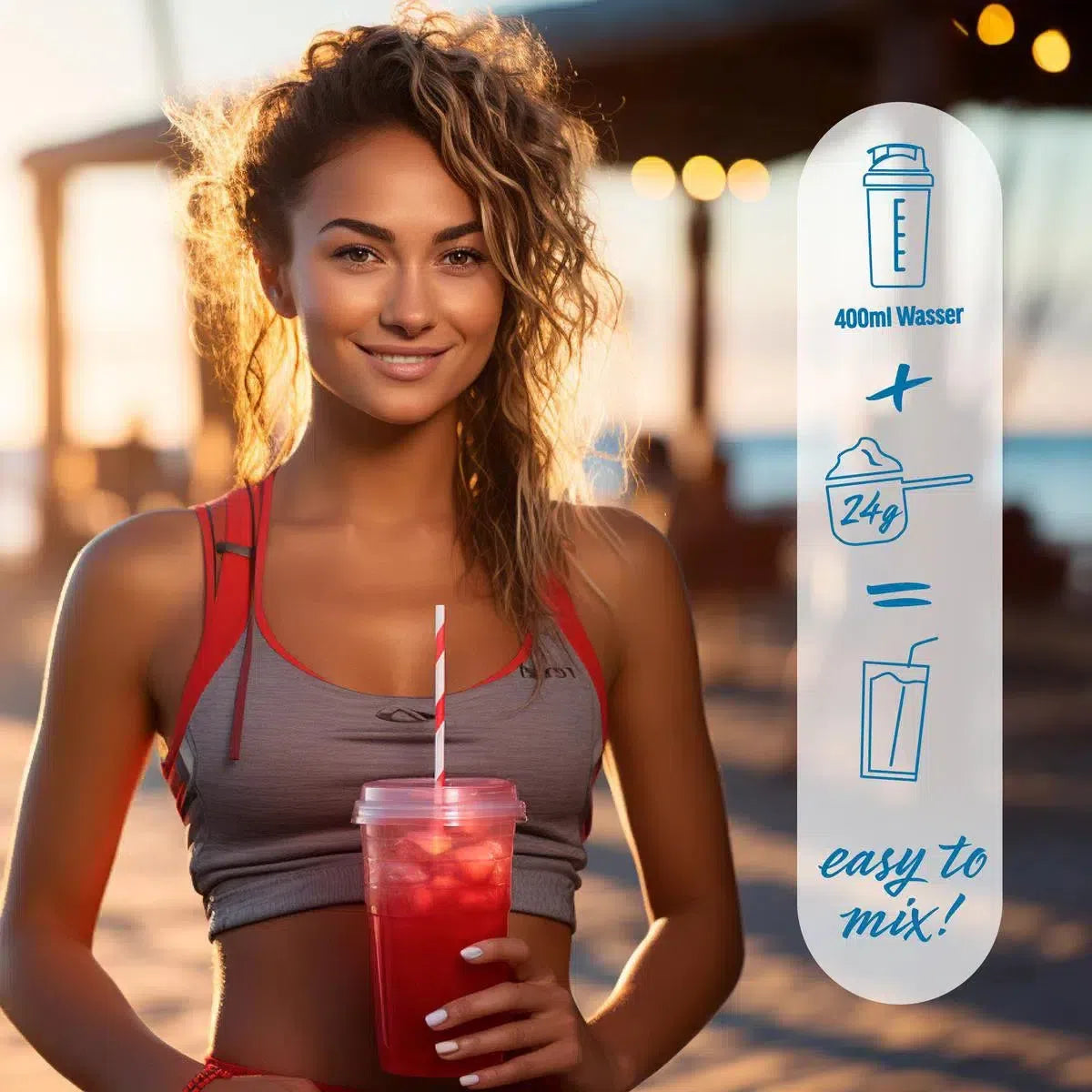 Mix das Pulver mit Wasser zu einem fruchtigen und erfrischenden Shake. Verfeinere geschmacklich neutrale Joghurts, Quark oder Backrezepte für einen extra Protein-Kick. Flexibel einsetzbar.