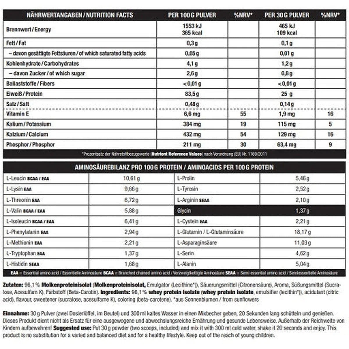 Molkenproteinisolat (enthält Emulgator Sonnenblumenlecithin) 95.5 %. Säuerungsmittel Zitronensäure. Aroma. Süßungsmittel (Sucralose. Acesulfam K). Farbstoff Beta-Carotin