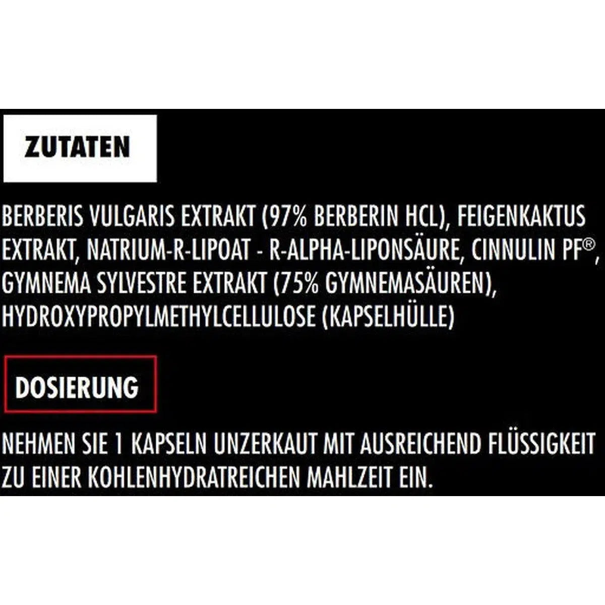 BERBERIS VULGARIS EXTRAKT (97% BERBERIN HCL), FEIGENKAKTUS EXTRAKT, ZIMT-EXTRAKT, GYMNEMA SYLVESTRE EXTRAKT (75% GYMNEMASÄUREN), HYDROXYPROPYLMETHYLCELLULOSE (KAPSELHÜLLE)