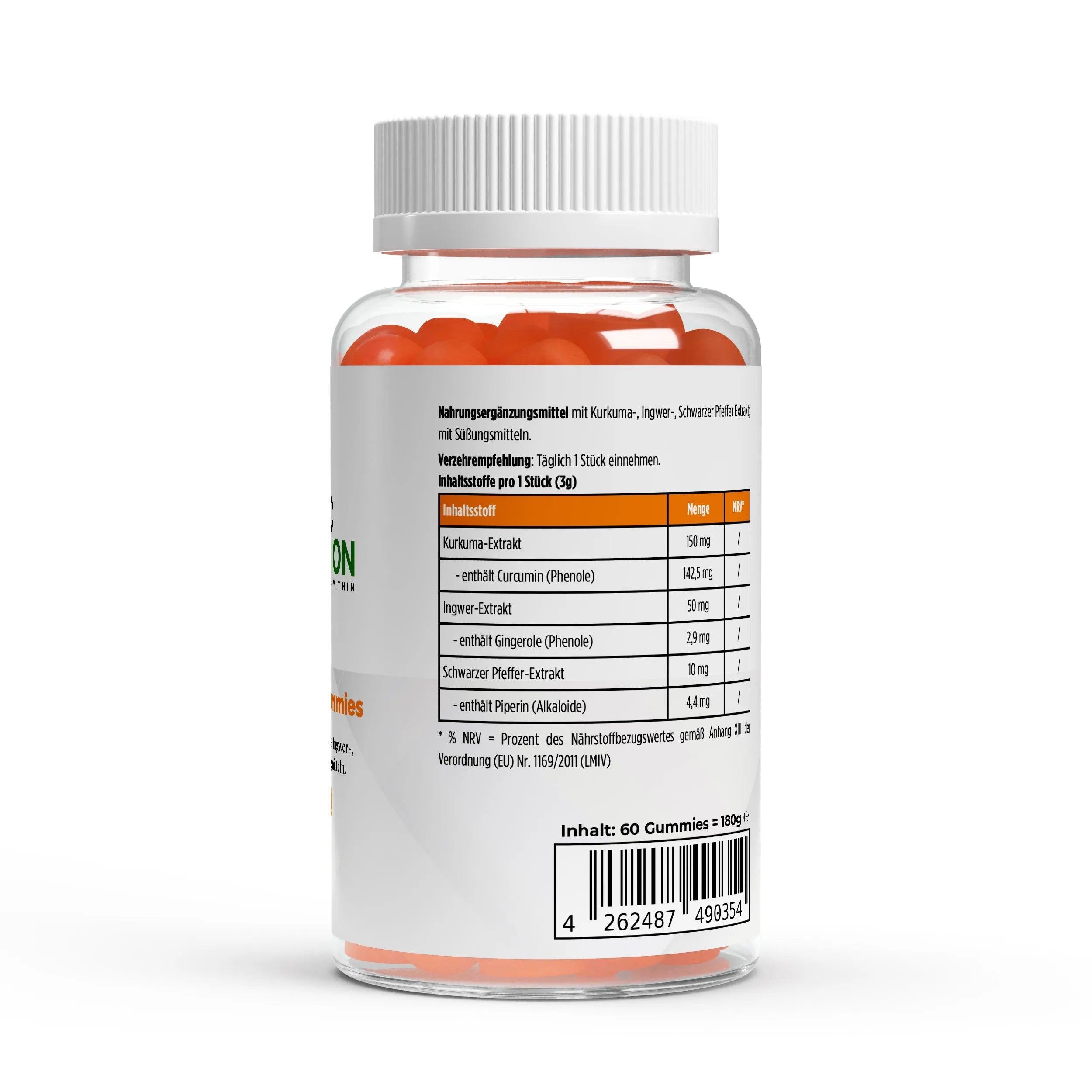 Süßungsmittel Maltit, Wasser, Süßungsmittel Isomalt, Feuchthaltemittel Sorbit, Kurkuma-Extrakt (5%, Curcuma longa), Geliermittel Pektin, Ingwerwurzel-Extrakt (1,6%, Zingiber officinale), Säureregulator Zitronensäure, Säureregulator Natriumcitrat, natürliches Orangenaroma, Schwarzer Pfeffer-Extrakt (0,3%, Piper nigrum), Stärke, Sonnenblumenöl, Überzugsmittel Carnaubawachs, Farbstoff Beta-Carotin