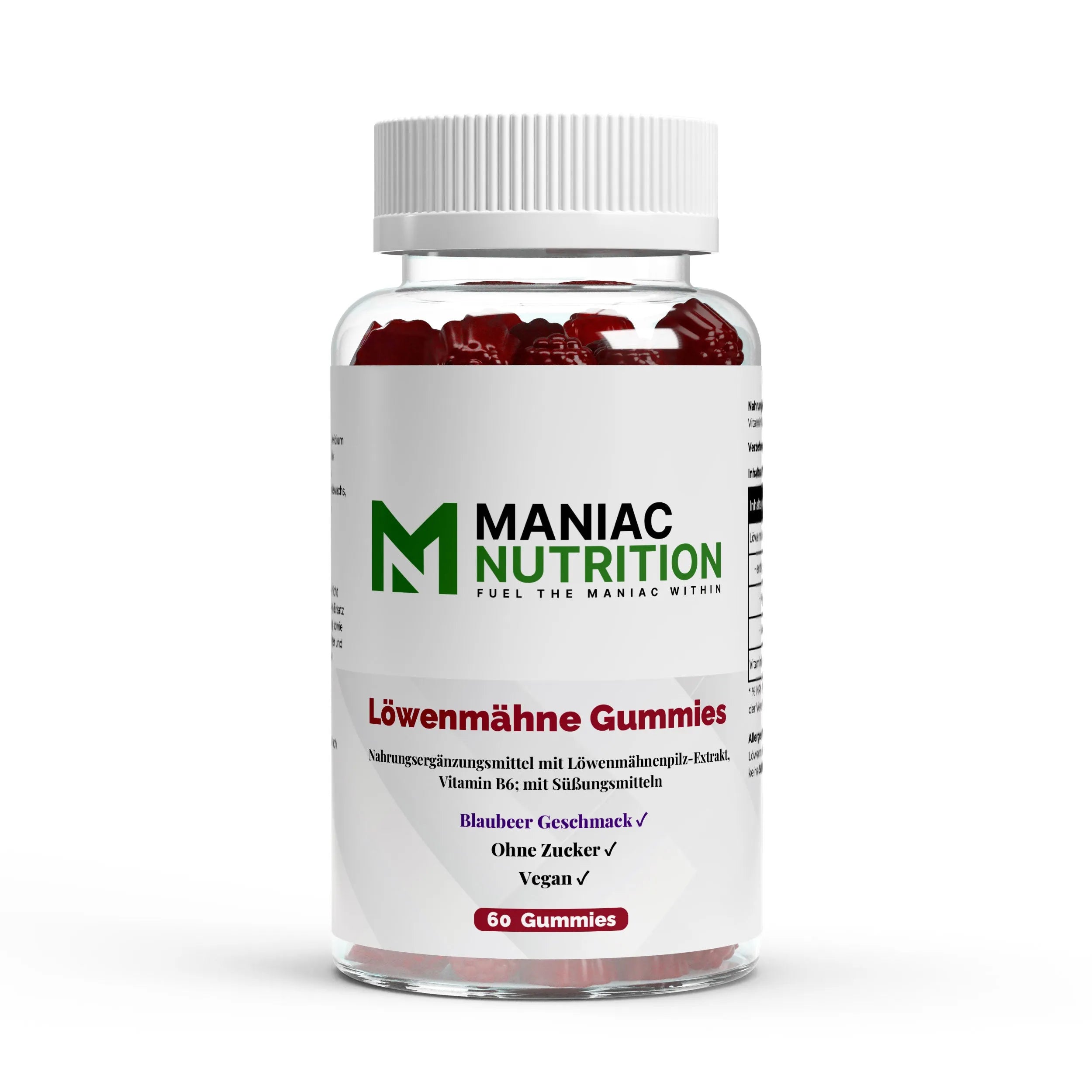 Verzehrempfehlung Maniac Nutrition Löwenmähne + Vitamin B6 Gummies 60 Stk.