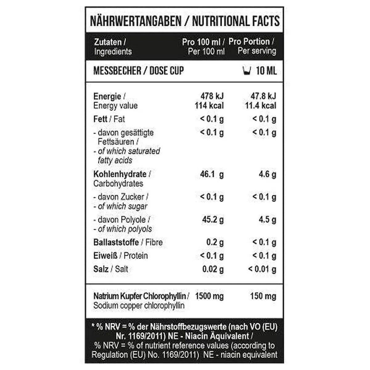 Wasser, Stabilisator (Glycerin), Natrium Kupfer Chlorophyllin, Aroma, Säuerungsmittel (Citronensäure), Verdickungsmittel (Xanthan), Konservierungsstoff (Kaliumsorbat), Emulgator (Mono- und Diglyceride von Speisefettsäuren).