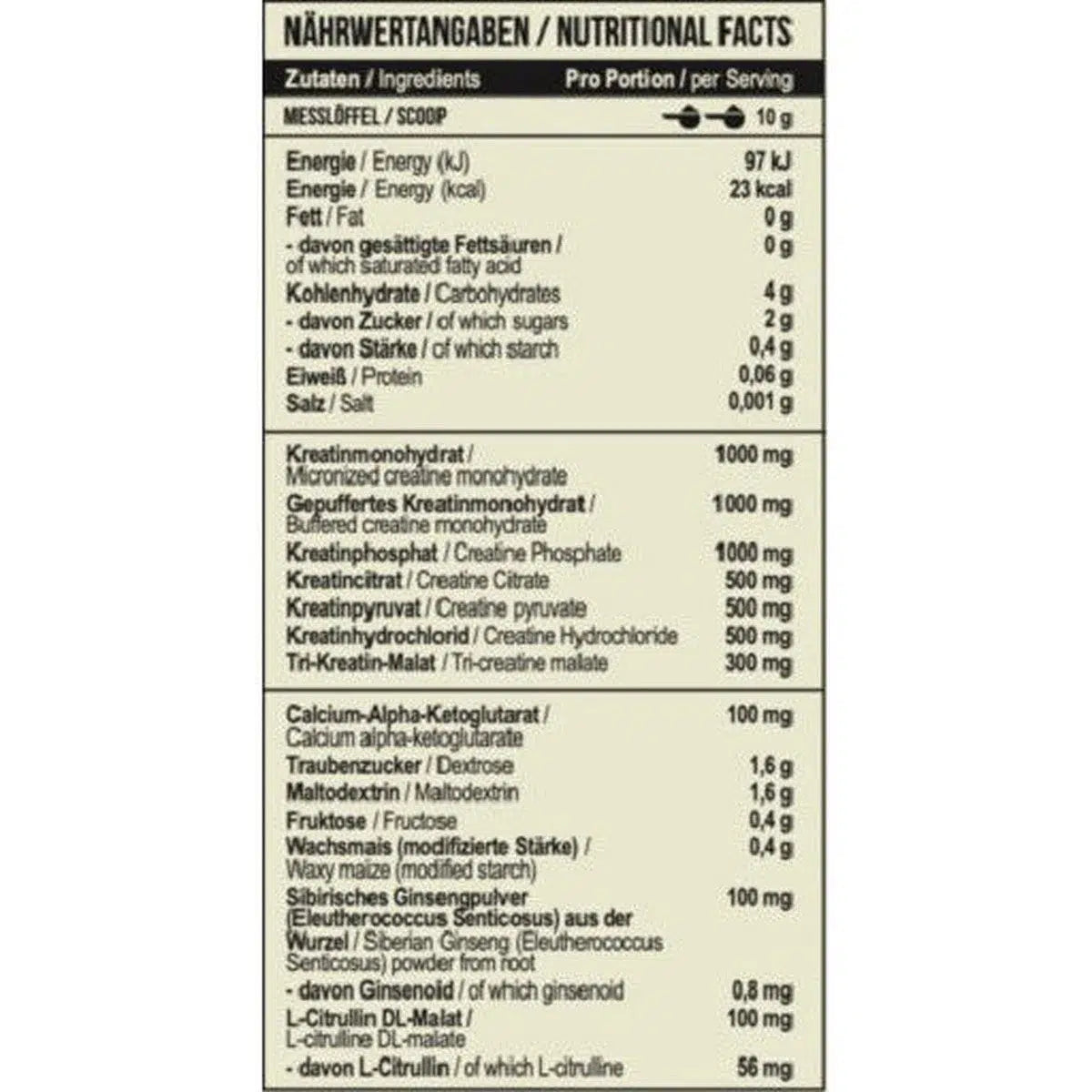 Dextrose, Maltodextrin, Kreatinphosphat, gepuffertes Kreatinmonohydrat, mikronisiertes Kreatinmonohydrat, Kreatincitrat, Kreatinpyruvat, Kreatinhydrochlorid, Aromen, Fructose, Wachsmais (modifizierte Stärke), Tri-Kreatinmalat, Zitronensäure, Süßstoffe (Sucralose), Calcium Alpha-Ketoglutarat, sibirisches Ginsengpulver (Eleutherococcus Senticosus) aus der Wurzel, L-Citrullin DL-Malat.