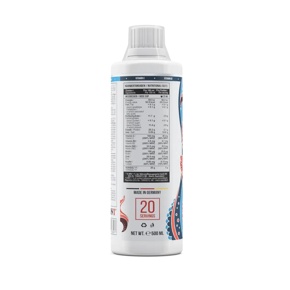 Wasser, Kollagenhydrolysat ᵃ (Ursprung: FISCH), Süßungsmittel (Erythrit), Säuerungsmittel (Milchsäure), Aroma, Vitamin C, Konservierungsstoff (Natriumbenzoat, Kaliumsorbat), Zinkcitrat, Niacin, Süßungsmittel (Sucralose, Steviolglycoside aus Stevia), Kupfergluconat, Vitamin B2, Biotin. ᵃ) VERISOL F®.