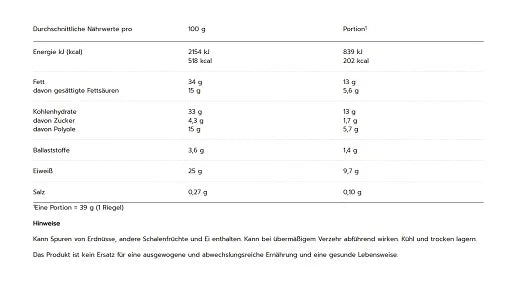 Genieße einen Riegel nach Bedarf. Überschreite nicht die empfohlene tägliche Verzehrsmenge.