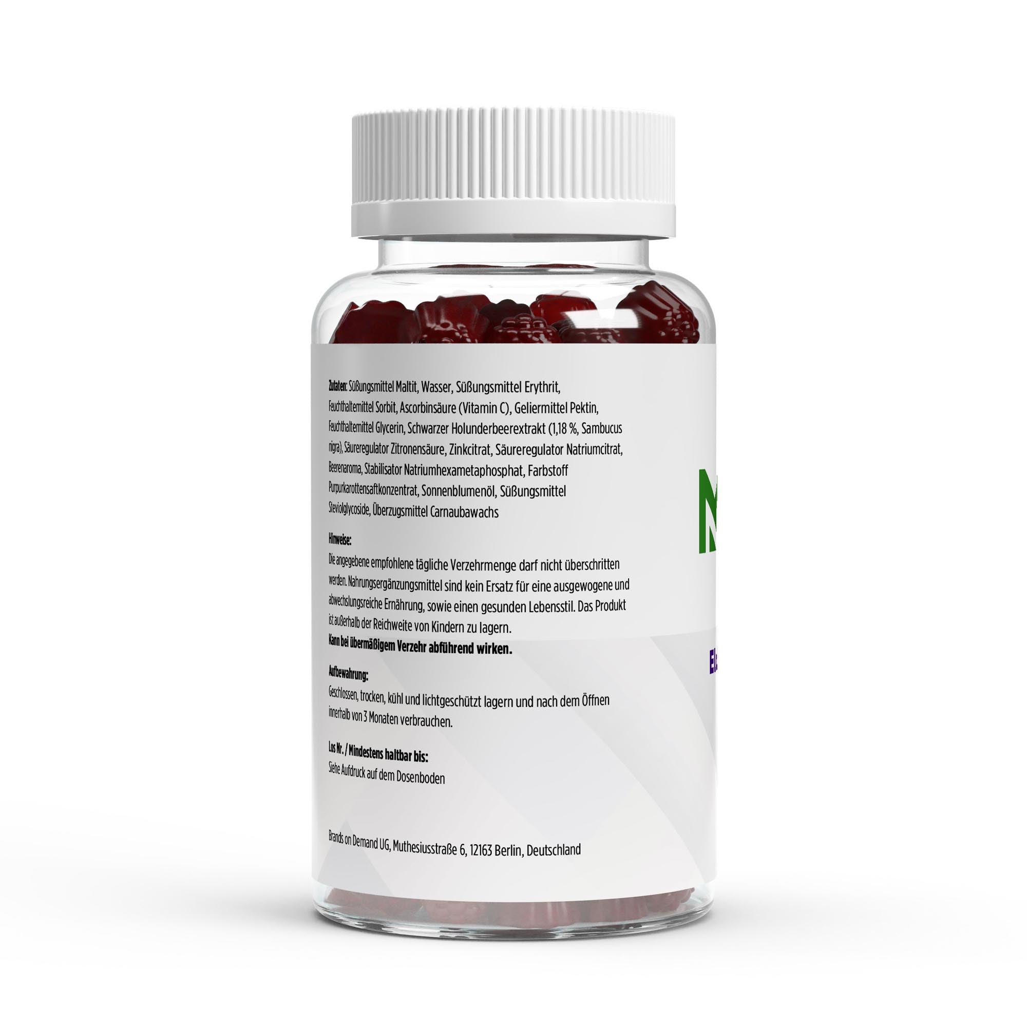 Süßungsmittel Maltit, Wasser, Süßungsmittel Erythrit, Feuchthaltemittel Sorbit, Ascorbinsäure (Vitamin C), Geliermittel Pektin, Feuchthaltemittel Glycerin, Schwarzer Holunderbeerextrakt (1,18 %, Sambucus nigra), Säureregulator Zitronensäure, Zinkcitrat, Säureregulator Natriumcitrat, Beerenaroma, Stabilisator Natriumhexametaphosphat, Farbstoff Purpurkarottensaftkonzentrat, Sonnenblumenöl, Süßungsmittel Steviolglycoside, Überzugsmittel Carnaubawachs.