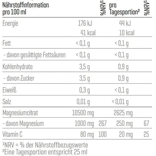 Wasser, Magnesiumcitrat 9,8%, Orangensaftkonzentrat 8%, Aroma, L-Ascorbinsäure, Konservierungsstoff Kaliumsorbat, Süßungsmittel Natriumcyclamat, Acesulfam K, Saccharin.