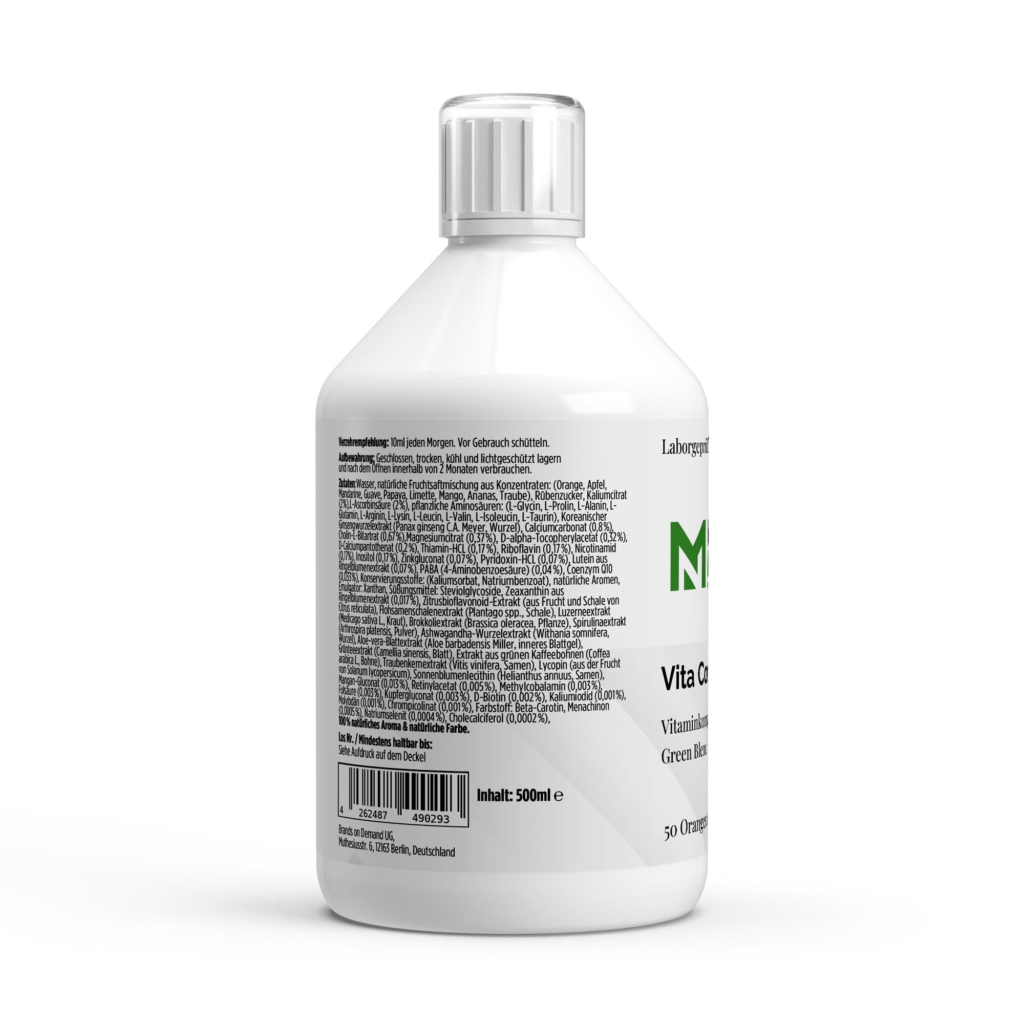 Wasser, Natürliche Fruchtsaftmischung aus Konzentraten (Orange, Apfel, Mandarine, Guave, Papaya, Limette, Mango, Ananas, Traube), Rübenzucker, Kaliumcitrat (2%), L-Ascorbinsäure (2%), Pflanzliche Aminosäuren (L-Glycin, L-Prolin, L-Alanin, L-Glutamin, L-Arginin, L-Lysin, L-Leucin, L-Valin, L-Isoleucin, L-Taurin), Koreanischer Ginsengwurzelextrakt (Panax ginseng C.A. Meyer, Wurzel), Calciumcarbonat (0,8%), Cholin-L-Bitartrat (0,67%), Magnesiumcitrat (0,37%), D-alpha-Tocopherylacetat (0,32%), D-Calciumpantothenat (0,2%), Thiamin-HCL (0,17%), Riboflavin (0,17%), Nicotinamid (0,17%), Inositol (0,17%), Zinkgluconat (0,07%), Pyridoxin-HCL (0,07%), Lutein aus Ringelblumenextrakt (0,07%), PABA (4-Aminobenzoesäure) (0,04%), Coenzym Q10 (0,033%), Konservierungsstoffe (Kaliumsorbat, Natriumbenzoat), Natürliche Aromen, Emulgator: Xanthan, Süßungsmittel: Steviolglycoside, Zeaxanthin aus Ringelblumenextrakt (0,017%), Zitrusbioflavonoid-Extrakt (aus Frucht und Schale von Citrus reticulata), Flohsamenschalenextrakt (Plantago spp., Schale), Luzerneextrakt (Medicago sativa L., Kraut), Brokkoliextrakt (Brassica oleracea, Pflanze), Spirulinaextrakt (Arthrospira platensis, Pulver), Ashwagandha-Wurzelextrakt (Withania somnifera, Wurzel), Aloe-vera-Blattextrakt (Aloe barbadensis Miller, inneres Blattgel), Grünteeextrakt (Camellia sinensis, Blatt), Extrakt aus grünen Kaffeebohnen (Coffea arabica L., Bohne), Traubenkernextrakt (Vitis vinifera, Samen), Lycopin (aus der Frucht von Solanum lycopersicum), Sonnenblumenlecithin (Helianthus annuus, Samen), Mangan-Gluconat (0,013%), Retinylacetat (0,005%), Methylcobalamin (0,003%), Folsäure (0,003%), Kupfergluconat (0,003%), D-Biotin (0,002%), Kaliumiodid (0,001%), Molybdän (0,001%), Chrompicolinat (0,001%), Farbstoff: Beta-Carotin, Menachinon (0,0005%), Natriumselenit (0,0004%), Cholecalciferol (0,0002%).
