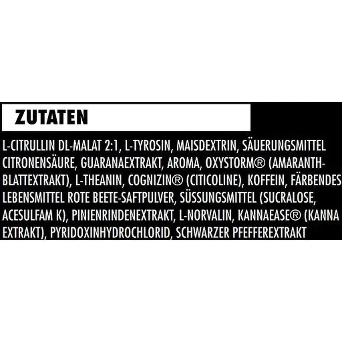 L-Citrullin DL-Malat 2:1, L-Tryosin, Maisdextrin, Säuerungsmittel Citronensäure, Guaranaextrakt, Aroma, Oxystorm ® (Amaranthblatt-Extrakt), L-Theanin, Cognizin ®, (Citicoline), Koffein, färbendes Lebensmittels Rote Beete-Saftpulver, Süßungsmittel (Sucralose, Acesulfam K), Pinienrindenextrakt, L-Norvalin, Kannaease ® (Kanna Extrakt), Pyridoxinhydrochlorid, Schwarzer Pfefferextrakt