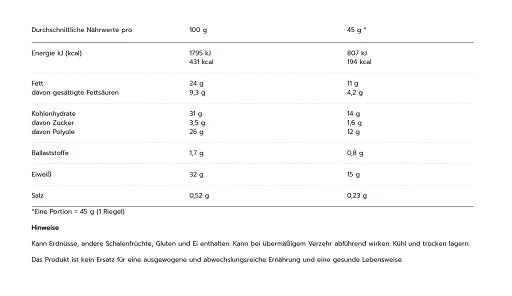 Die Proteinriegel sind kein Ersatz für eine ausgewogene Ernährung. Kühl und trocken lagern. Kann Spuren von Gluten, Ei, Nüssen und Soja enthalten.