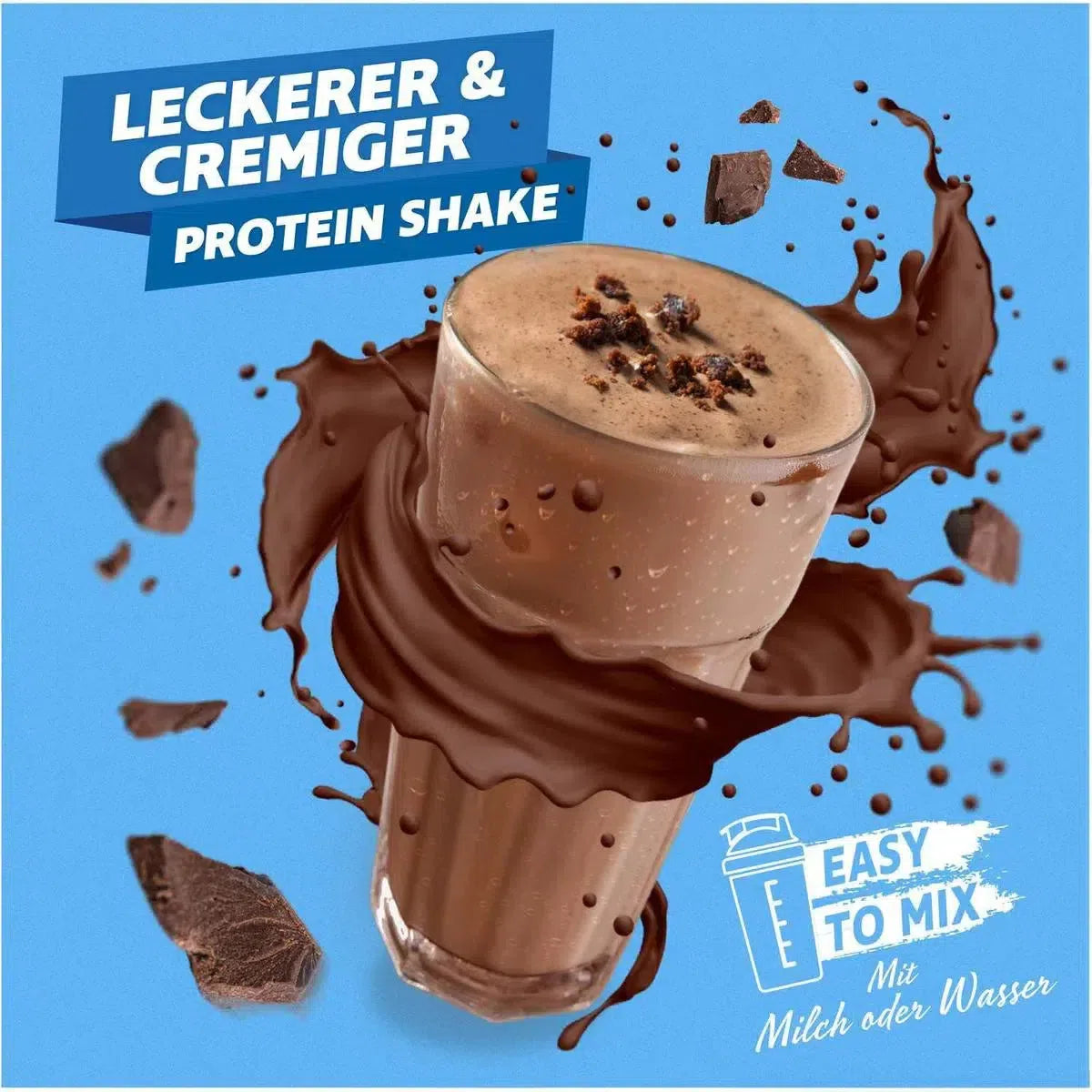 Milcheiweiß (80%), Kakapoulver (entölt) (6%), Molkeneiweißisolat (5%), Ei-Protein (3%), Molkeneiweißkonzentrat (2%), Aroma, Magnesiumcarbonat, Verdickungsmittel Guarkernmehl, Süßungsmittel Sucralose, Ascorbinsäure, Nicotinsäureamid, DL-Alpha-Tocopherylacetat, Calcium-D-Pantothenat, Pyridoxinhydrochlorid, Thiaminhydrochlorid, Riboflavin, Biotin, Cyanocobalamin.