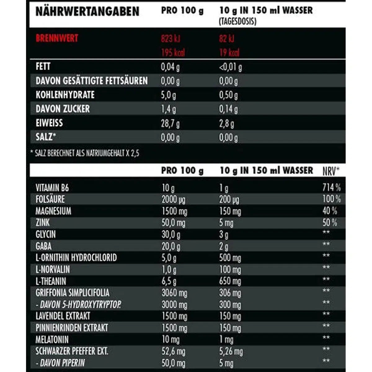 GLYCIN, GLUTAMINSÄURE, GRIFFONIA SIMPLICIFOLIA, MAGNESIUMBISGLYCINAT, SÄUERUNGSMITTEL (CITRONENSÄURE), GRÜNTEEBLATTextrakt, GLUCO-FASER, WEIZEN-BALLASTSTOFF, HCL, AROMA, PINIENRINDEN-EXtrakt, LAVENDEL EXTRAKT, L-NORVALIN, SÜSSUNGSMITTEL (SUCULOSE), ZINKBISGLYCINAT, PYRIDOXINHYDROCHLORID, SCHWARZER PFEFFER-EXtrakt, MELATONIN, L-GLUTAMINSÄURE