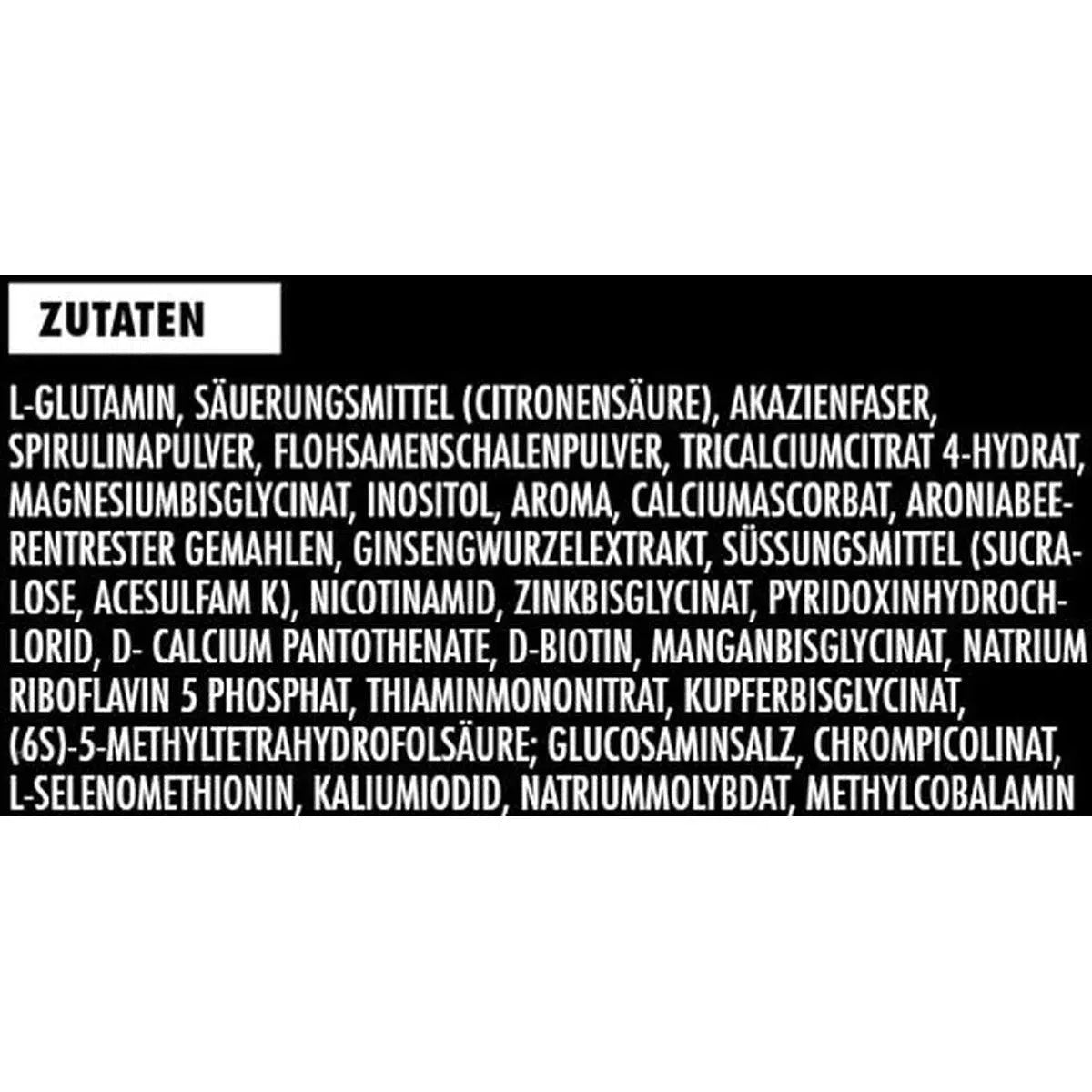 Zutaten: L-GLUTAMIN, SÄUERUNGSMITTEL (CITRONENSÄURE), AKAZIENFASER, SPIRULINAPULVER, FLOHSAMENSCHALENPULVER, TRICALCIUMCITRAT 4-HYDRAT, MAGNESIUMBISGLYCINAT, INOSITOL, AROMA, CALCIUMASCORBAT, ARONIABEE- RENTRESTER GEMAHLEN, GINSENGWURZELEXTRAKT, SÜSSUNGSMITTEL (SUCRA- LOSE, ACESULFAM K), NICOTINAMID, ZINKBISGLYCINAT, PYRIDOXINHYDROCH- LORID, D- CALCIUM PANTOTHENATE, D-BIOTIN, MANGANBISGLYCINAT, NATRIUM RIBOFLAVIN 5 PHOSPHAT, THIAMINMONONITRAT, KUPFERBISGLYCINAT, (6S)-5-METHYLTETRAHYDROFOLSÄURE; GLUCOSAMINSALZ, CHROMPICOLINAT, L-SELENOMETHIONIN, KALIUMIODID, NATRIUMMOLYBDAT, METHYLCOBALAMIN.