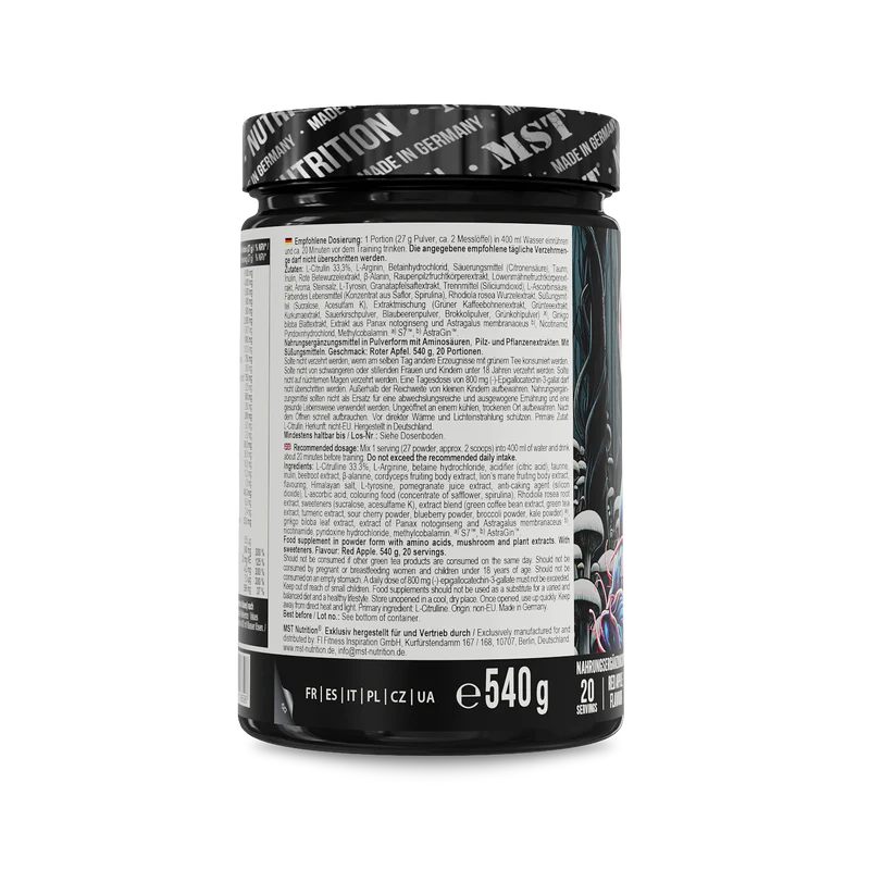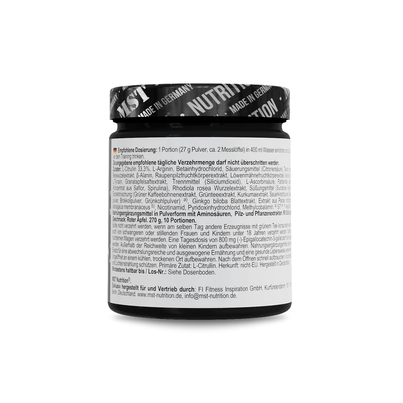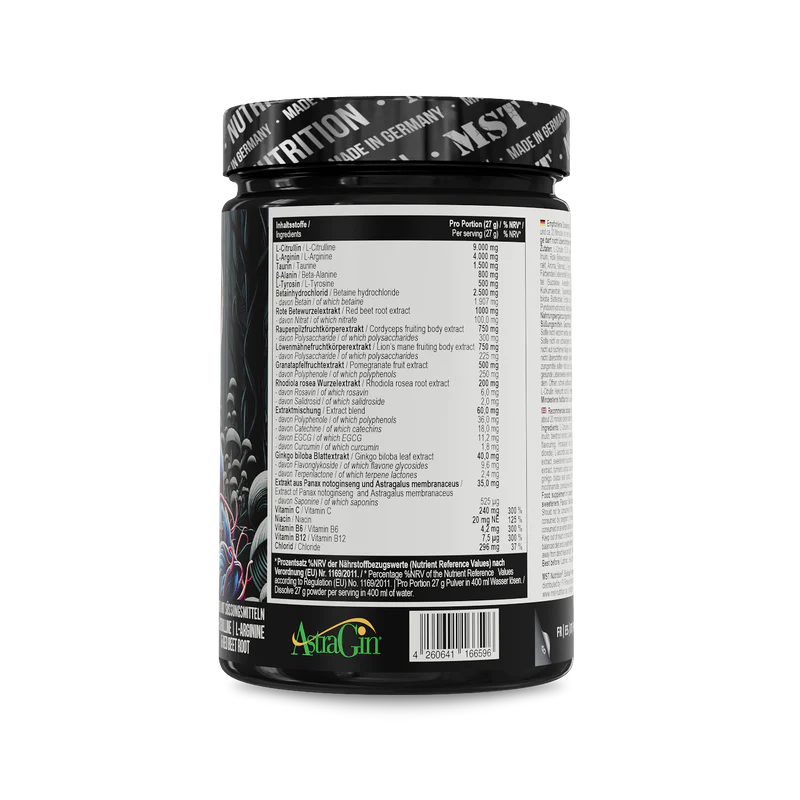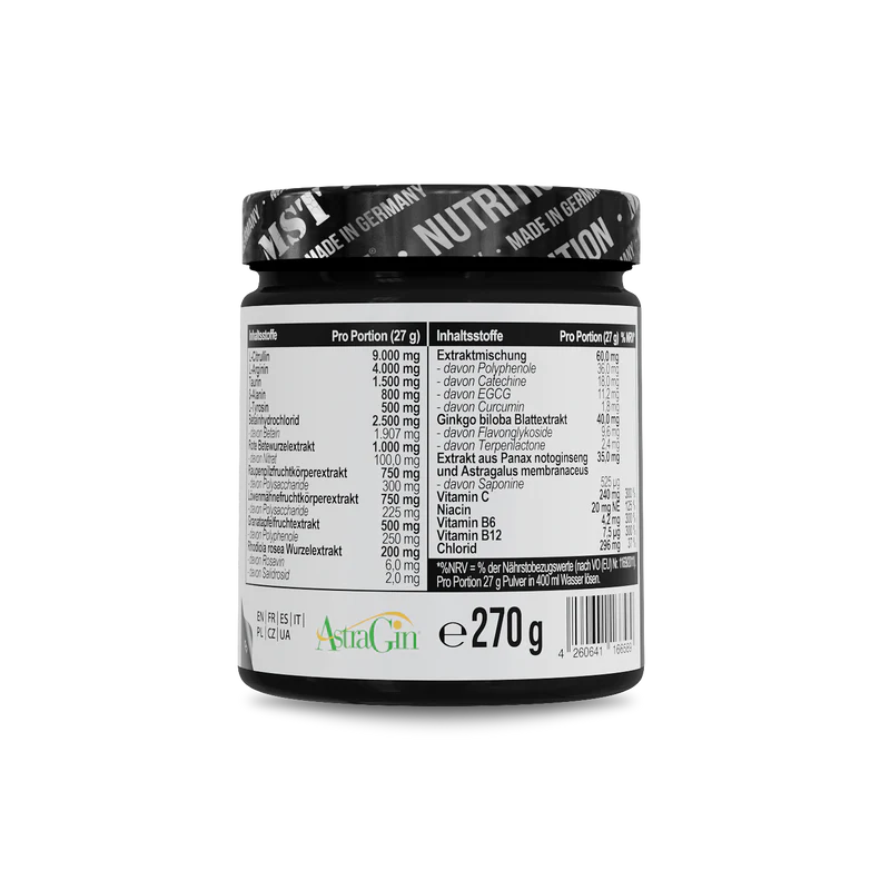 L-Citrullin 33,3%, L-Arginin, Betainhydrochlorid, Säuerungsmittel (Citronensäure), Taurin, Inulin, Rote Betewurzelextrakt, β-Alanin, Raupenpilzfruchtkörperextrakt, Löwenmähnefruchtkörperextrakt, Aroma, Steinsalz, L-Tyrosin, Granatapfelsaftextrakt, Trennmittel (Siliciumdioxid), L-Ascorbinsäure, Färbendes Lebensmittel (Konzentrat aus Saflor, Spirulina), Rhodiola rosea Wurzelextrakt, Süßungsmittel (Sucralose, Acesulfam K), Extraktmischung (Grüner Kaffeebohnenextrakt, Grünteeextrakt, Kurkumaextrakt, Sauerkirschpulver, Blaubeerenpulver, Brokkolipulver, Grünkohlpulver), Ginkgo biloba Blattextrakt, Extrakt aus Panax notoginseng und Astragalus membranaceus, Nicotinamid, Pyridoxinhydrochlorid, Methylcobalamin.